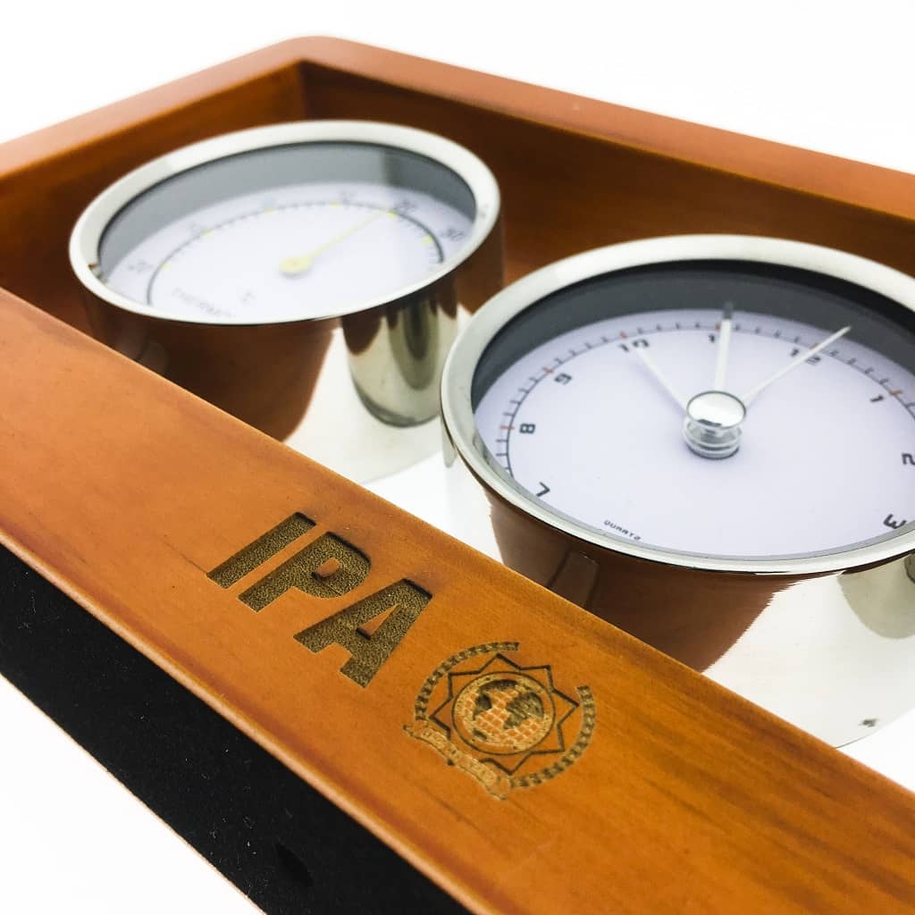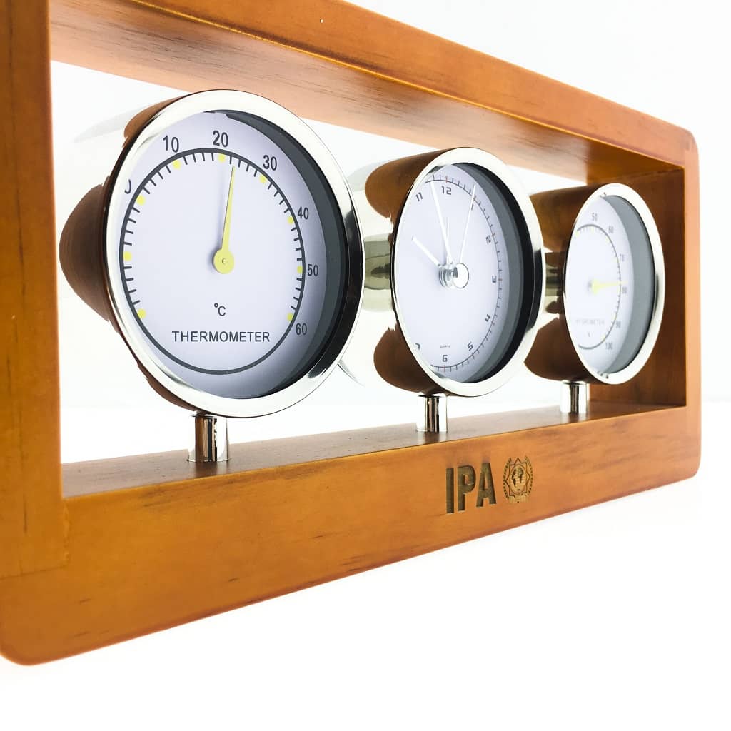 Ceas pentru birou echipat cu hidrometru si termometru, confectionat din lemn.