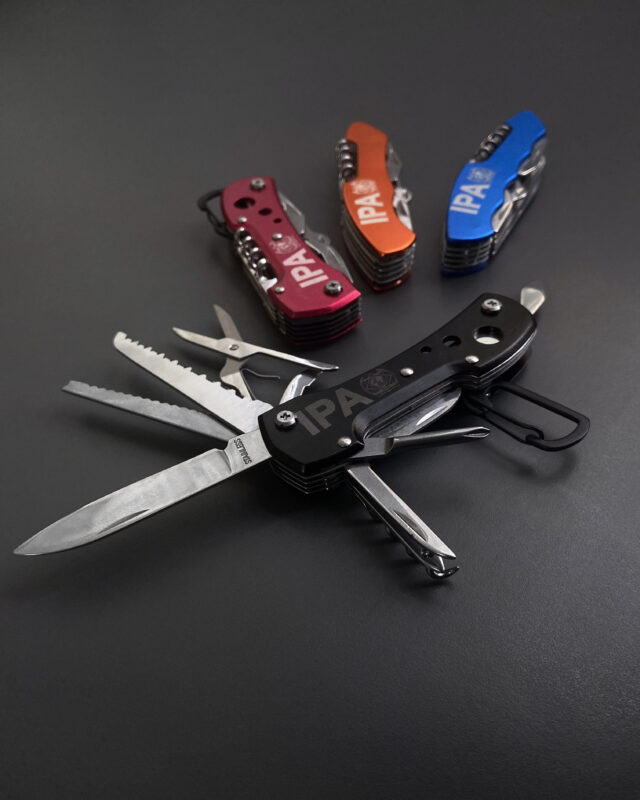Briceag de buzunar cu 12 funcții: cuțit, ferăstrău, foarfece, deschizător de conserve, tirbușon, desfacător de sticle, șurubelniță cu sloturi, șurubelniță în cruce, perforator și alezor, sulă de cusut, scalpel, pilă de unghii și carabină.
