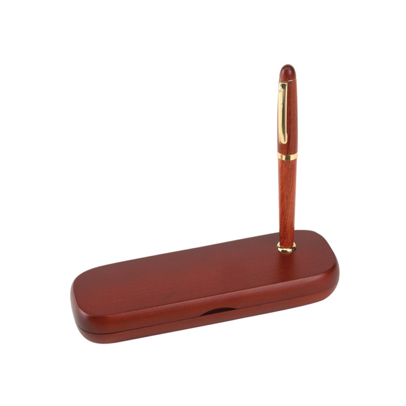 Pix şi stilou cu corp din lemn de trandafir şi decoraţii strălucitoare aurii, ambalat în cutie din lemn.