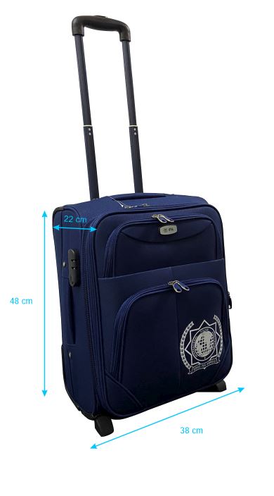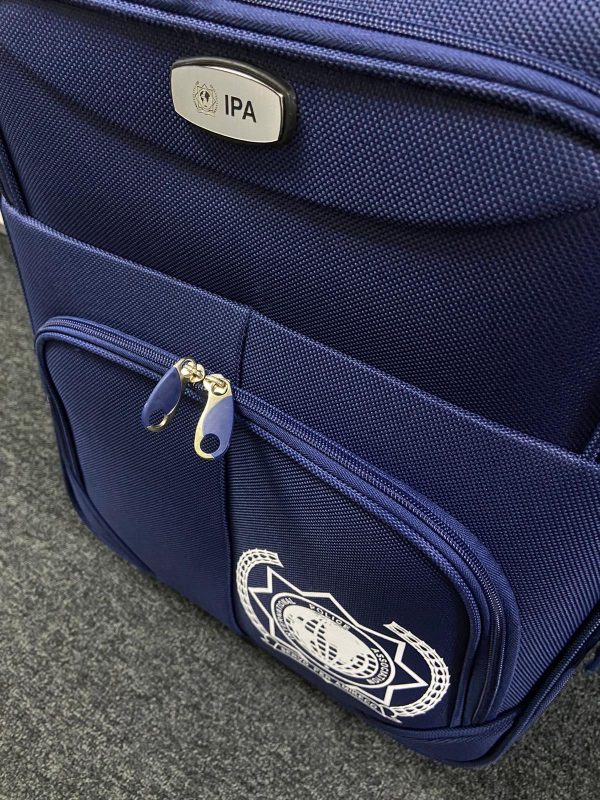 Troler personalizat cu însemnele oficiale IPA, compus dintr-un spațiu principal pentru haine securizat cu cifru și două buzunare laterale.